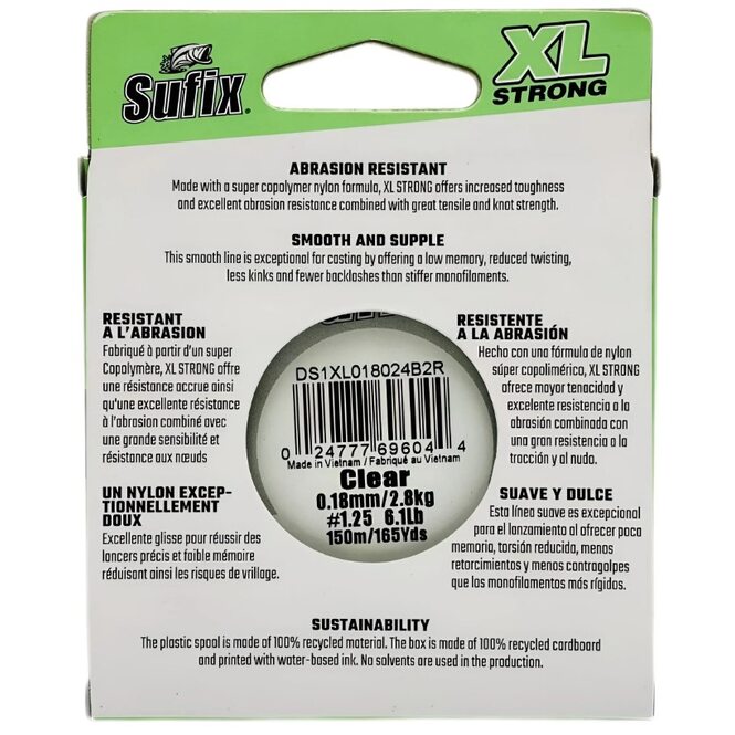 Будучи исключительно мягкой, гибкой и гладкой и имея высокую разрывную нагрузку, в том числе на узлах, леска Sufix Xl Strong универсальна и отлично подходит для разных видов рыбалки. Благодаря своей мягкости она не скручивается и хорошо летит при забросе, образует меньше петель, чем жёсткие нити. Леска Sufix XL Strong 150м 0.18мм 2.8кг изготовлена из высококачественного нейлонового сополимера и обладает особой прочностью и превосходной износостойкостью. Малорастяжимый полиамид позволяет подсекать быстро и эффективно, а его устойчивость к рывкам уменьшает количество обрывов при вываживании. Xl Strong почти не имеет памяти.