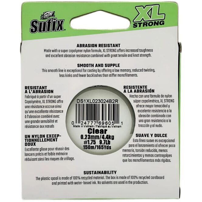 Будучи исключительно мягкой, гибкой и гладкой и имея высокую разрывную нагрузку, в том числе на узлах, леска Sufix Xl Strong универсальна и отлично подходит для разных видов рыбалки. Благодаря своей мягкости она не скручивается и хорошо летит при забросе, образует меньше петель, чем жёсткие нити. Леска Sufix XL Strong 150м 0.23мм 4.4кг изготовлена из высококачественного нейлонового сополимера и обладает особой прочностью и превосходной износостойкостью. Малорастяжимый полиамид позволяет подсекать быстро и эффективно, а его устойчивость к рывкам уменьшает количество обрывов при вываживании. Xl Strong почти не имеет памяти.