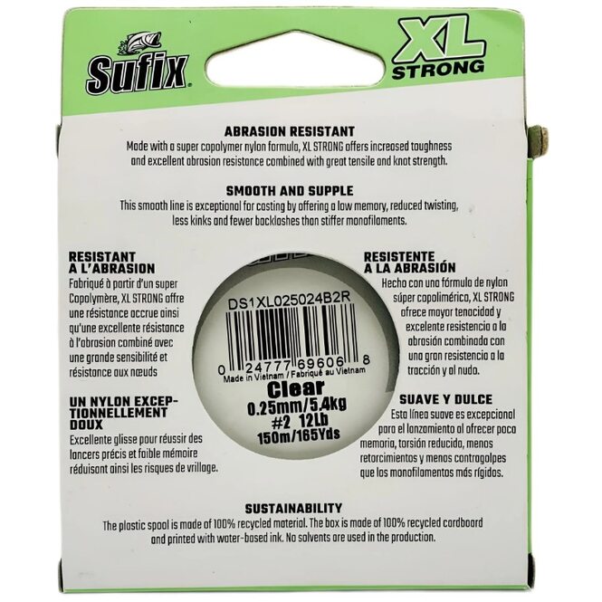 Будучи исключительно мягкой, гибкой и гладкой и имея высокую разрывную нагрузку, в том числе на узлах, леска Sufix Xl Strong универсальна и отлично подходит для разных видов рыбалки. Благодаря своей мягкости она не скручивается и хорошо летит при забросе, образует меньше петель, чем жёсткие нити. Леска Sufix XL Strong 150м 0.25мм 5.4кг изготовлена из высококачественного нейлонового сополимера и обладает особой прочностью и превосходной износостойкостью. Малорастяжимый полиамид позволяет подсекать быстро и эффективно, а его устойчивость к рывкам уменьшает количество обрывов при вываживании. Xl Strong почти не имеет памяти.