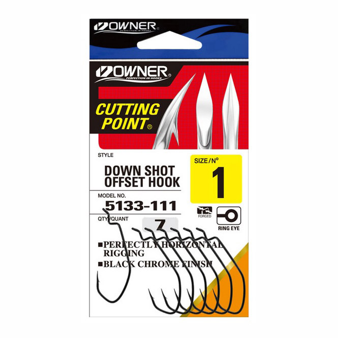 Крючки офсетные Owner 5133 B-73 #1 (7 шт.) созданы для оснасток типа дроп - шот. Колечко на цевье чуть отогнуто вверх, что значительно упрощает фиксацию и способствует правильному расположению крючка относительно лески. Крючок имеет загиб оригинальной формы, острейшую заточку Cutting Point + изготовлен из достаточно тонкой проволоки, что позволяет использовать нежные приманки.