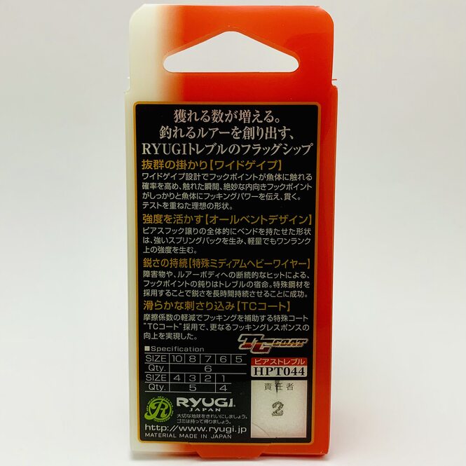 Флагманская серия RYUGI HPT044 Pierce Treble TC - это серия высококачественных тройных крючков особой «проникающей» конструкции. Дизайн с широким захватом, выстраданный многолетней практикой, увеличивает вероятность контакта с телом рыбы, в момент которого изогнутое вовнутрь острейшее жало легко просекает тело трофея. Специалисты RYUGI утверждают, что смогли разработать идеальную форму тройного крючка, на основе бесчисленного количества тестов.