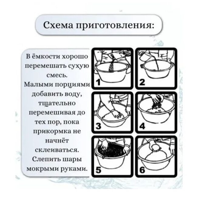 Прикормка имеет достаточную калорийность и пищевую ценность, лучше будет работать по активной рыбе. Имеет среднюю фракцию. Не слишком активная, но и не слишком инертная. Пить будет примерно 400 мл воды на 1кг сухой смеси.