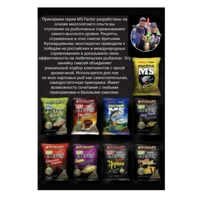 Прикормки Dunaev серии MS Factor разработаны на основе многолетнего опыта выступления на рыболовных соревнованиях самого высокого уровня.