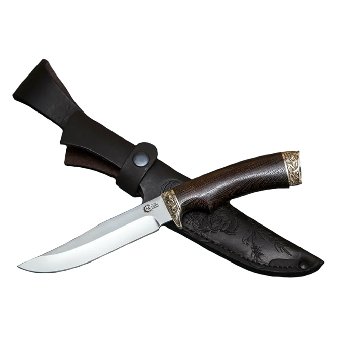 Клинок изготовлен из стали Х12МФ, а это значит, что его острота заточки на высоте. Установлено, что даже после разделки по костям и вскрывания металлических банок лезвие ножа остаётся острым, без засечек. Такой клинок славится своей прочностью, сталь выдерживает морозы и жару, при этом лезвие не портится. Крепкая рукоятка из венге удобно ложится в руку при любом хвате, поэтому если Вы ищите презент для настоящего мужчины, кованный нож Мангуст станет отличным вариантом подарка.